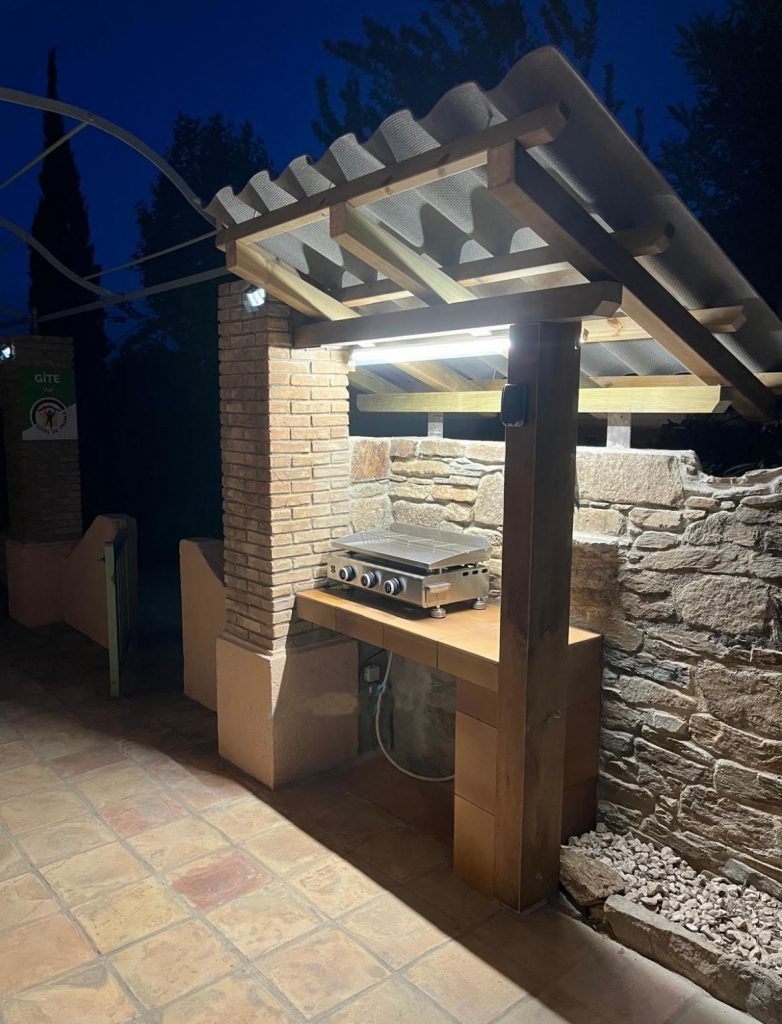 En cette année 2025, nous mettons à votre disposition une superbe plancha couverte en pierre et éclairée pour de bons barbecues en extérieur en journées comme en soirées et profiter à plein de la terrasse.